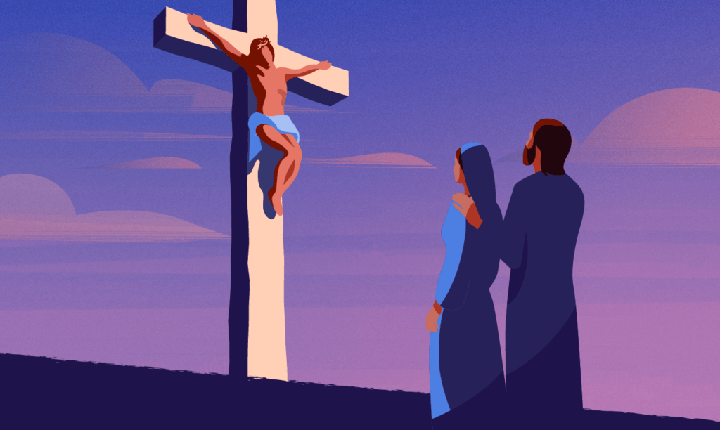Thứ năm, cuộc hội thoại ngắn giữa Chúa Giê-su, Mẹ Maria, và người môn đệ Chúa yêu. Truyền thống Giáo hội nói người môn đệ Chúa yêu rất có thể là Gioan, nhưng nhiều học giả hiện đại cho rằng, người môn đệ Chúa yêu đó có thể là bất cứ ai trong chúng ta, mà cũng có thể ám chỉ là Giáo hội Chúa nói chung. Đức Giê-su đã thể hiện tình yêu quan tâm của Người cho đến phút cuối, Chúa giao Mẹ Người cho giáo hội để giáo hội yêu mến, quan tâm và chăm sóc Mẹ, noi gương Mẹ như là hình mẫu tuyệt vời sống đẹp ý Chúa, vâng theo Lời Chúa cho đến cùng, đồng thời Chúa cũng giao giáo hội cho Mẹ Người để được Mẹ chăm sóc dạy dỗ họ sống theo Lời Chúa như xưa Chúa đã từng được Mẹ dạy. Cách Chúa gọi Mẹ là “Người phụ nữ” nhằm ám chỉ liên hệ đến một cuộc tạo thành mới mà chính Ngài là Adam mới và Mẹ Maria là Eva mới. Cuộc tạo thành mới này bắt đầu manh nha ngay tại chân thập giá Chúa Kito.