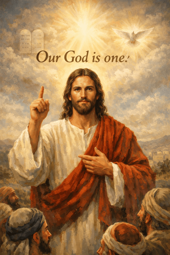 Tin Mừng theo Macco kể rằng, có một kinh sư đến hỏi Đức Giêsu: “Điều răn nào là quan trọng nhất?” Đức Giêsu không trả lời bằng một danh sách luật, Người bắt đầu bằng một câu rất cổ xưa trong Sách Thánh, trích từ Sách Đệ Nhị Luật 6:4: “Hãy nghe đây, Israel: Đức Chúa, Thiên Chúa chúng ta, là Đức Chúa duy nhất.” Đó là lời kinh, lời tuyên xưng đức tin hằng ngày của dân Do Thái, gọi là “Shema”. Ta thấy, Đức Giêsu nói một cách thẳng thắn, không vòng vo hay triết lý dài dòng: Chúng ta chỉ có một Thiên Chúa.