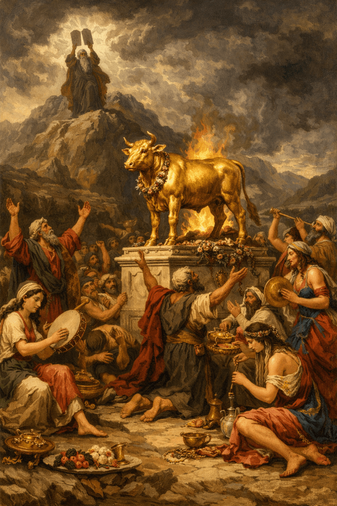Một trong những câu chuyện nổi tiếng nhất là con bê vàng (Xh 32). Dân Israel, vừa mới thoát khỏi Ai Cập, đã nói với Aaron: “Xin ông làm cho chúng tôi một vị thần đi trước chúng tôi” (Xh 32,1). Họ không phủ nhận Thiên Chúa hoàn toàn, họ chỉ muốn một hình ảnh “Thần linh” cụ thể, dễ kiểm soát. Khi tượng được đúc xong, họ tuyên bố: “Đây là thần của ngươi, hỡi Israel, đã đưa ngươi ra khỏi đất Ai Cập!” (Xh 32,4). Đây là điểm vô cùng nguy hiểm: họ gán hành động của Thiên Chúa cho một vật do tay họ làm ra. Các ngôn sứ sau này nói rất thẳng về điều đó. Trong sách Ngôn sứ Isaia: “Họ đẽo gỗ… một nửa thì đốt để sưởi, nửa kia thì làm thần mà thờ” (Is 44,14–17). Nghe có vẻ châm biếm, nhưng đó là sự thật trần trụi: con người tạo ra ngẫu tượng, rồi lại quỳ lạy nó.